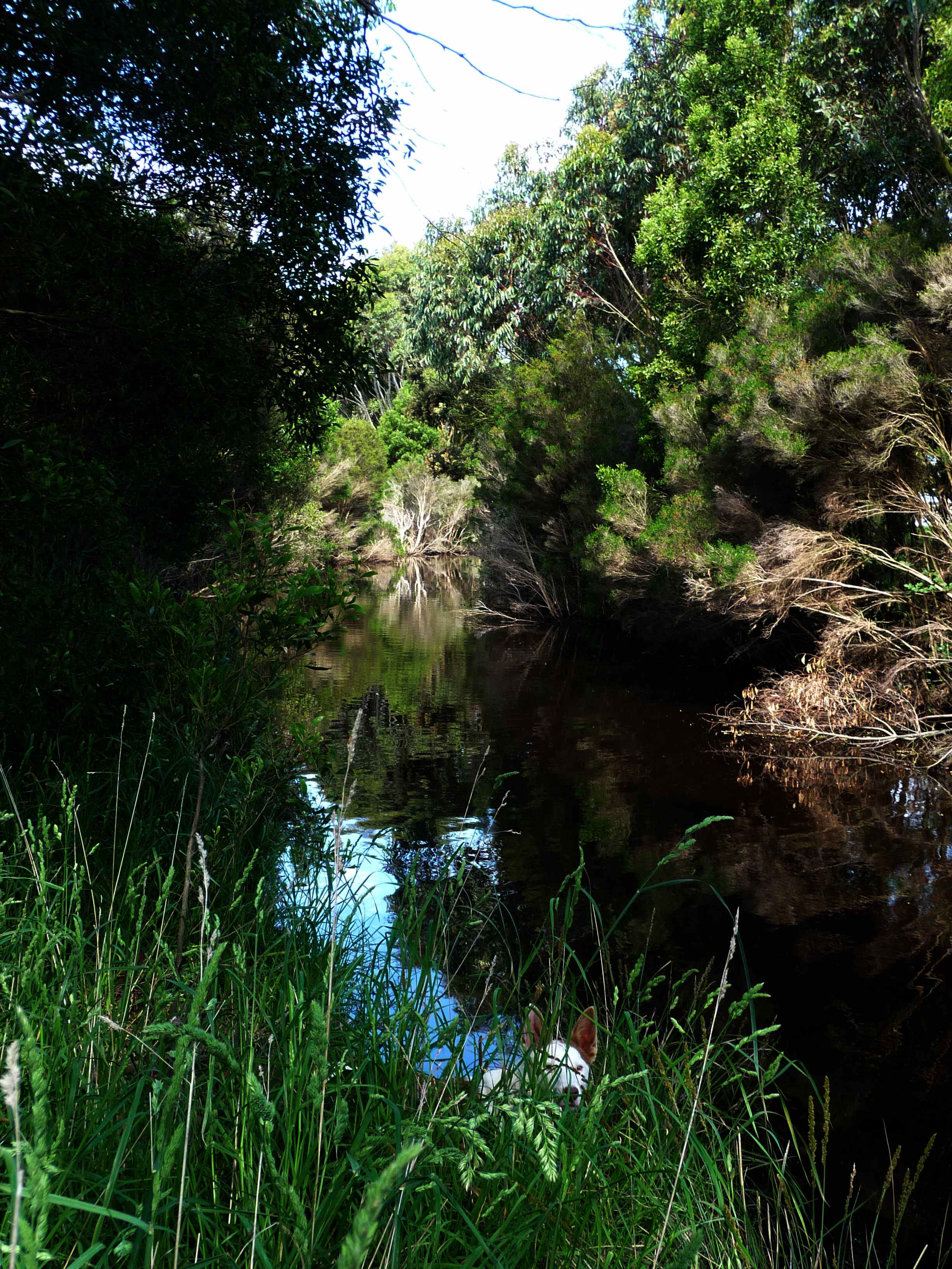 The fish had gaping golden lips and flashy golden bellies to match. Each seemed about 2-feet long and oh-so-muscular. I may be a piscean but I know nothing about fish. Perhaps this group of half a dozen or so monsters are the dreaded carp, washed into the gully during one of this year’s floods. And what are they doing? Breathing or breeding?