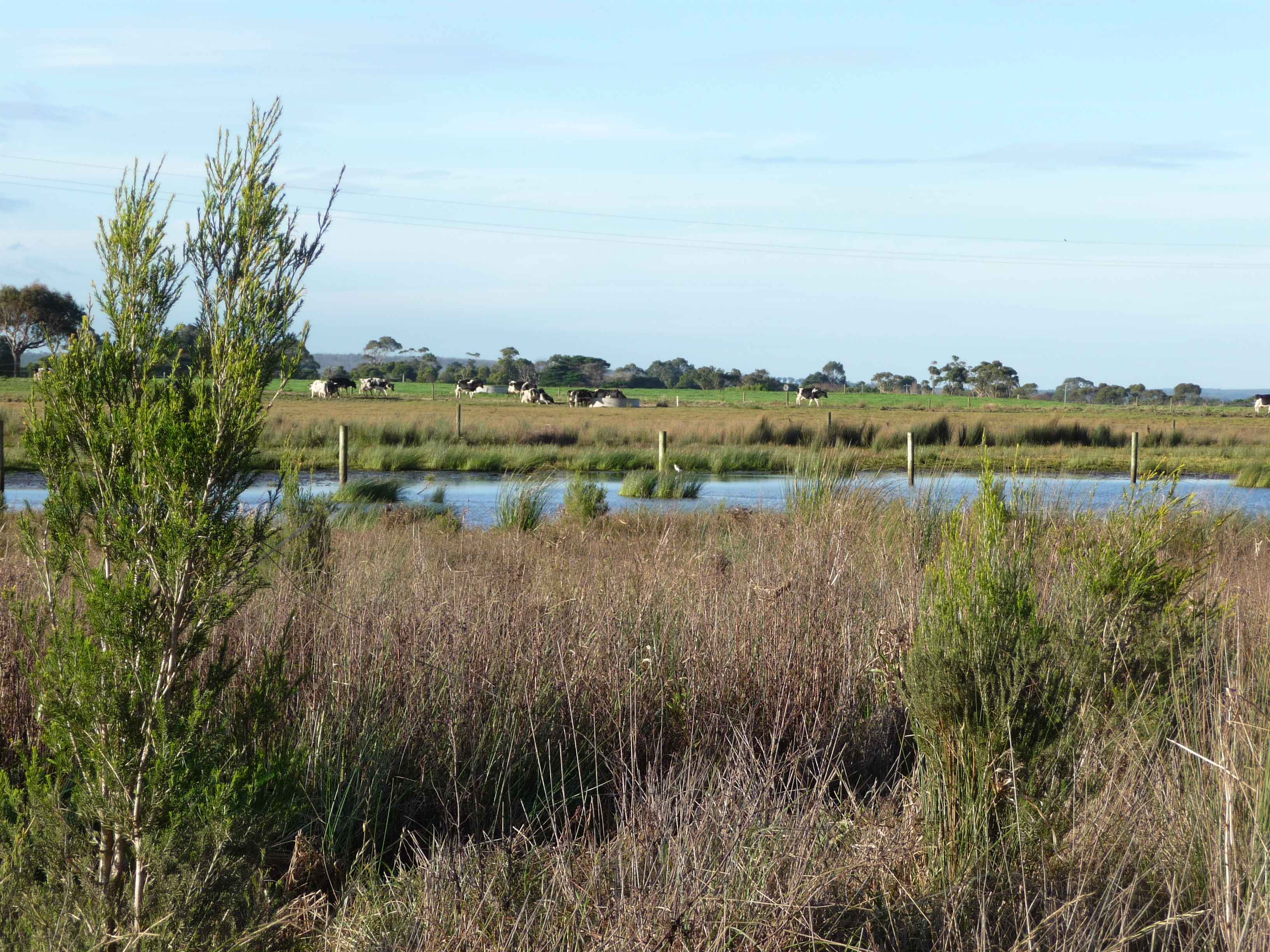 I fixed the laneway and found Ball Face and Fernando in the newly planted-out wetland. Aargh! Not my precious revegetation!!! The pair of them had left a trail of sagging wires and were busily roughing up some melaleucas. Can you spot them?